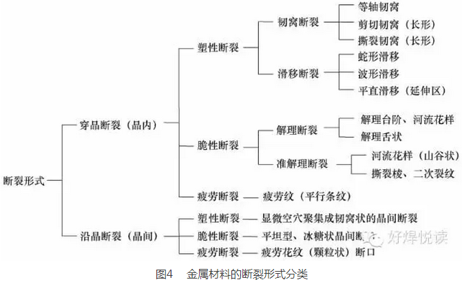 以上簡(jiǎn)要介紹了焊接裂紋中常遇到的幾種斷口形貌。實(shí)際上還有更多類型的斷口形貌,如疲勞斷裂、液膜斷裂等。由于多種因素的影響,在一個(gè)斷口上常出現(xiàn)幾種不同的混合斷口形貌(DR+QC+IG),這一點(diǎn)在斷口分析時(shí)應(yīng)特別注意。