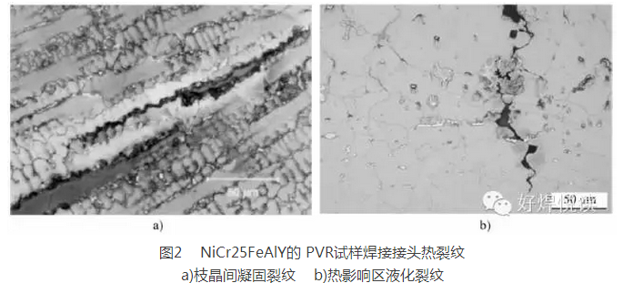 (1)熱裂紋 對(duì)于低碳鋼、強(qiáng)度級(jí)別較低的低合金鋼、鎳基合金、不銹鋼、鋁合金等,熱裂紋主要出現(xiàn)在焊縫,并且具有沿晶的特征,有時(shí)還帶有氧化的色彩。如果某結(jié)構(gòu)出現(xiàn)具有上述特征的裂紋,就可以判斷為熱裂紋,如圖2所示為鎳基合金熱裂紋形貌。有時(shí)熱裂紋也出現(xiàn)在近縫區(qū),但具有上述的特征,所以仍可以作出判斷。結(jié)晶裂紋與沿奧氏體晶界的先共析鐵素體中的低熔點(diǎn)非金屬夾雜物有關(guān),這些夾雜物一般與結(jié)晶裂紋連在一起,起著誘發(fā)結(jié)晶裂紋的作用。