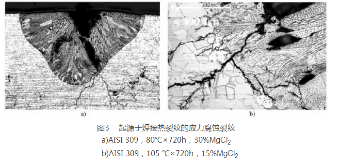 最后應(yīng)當(dāng)指出,某種材料在某種焊接工藝條件下,具有產(chǎn)生多種裂紋的可能,所以常在同一條裂紋上或在相近的部位產(chǎn)生不同性質(zhì)的裂紋。有時(shí)在熱裂紋或冷裂紋的基礎(chǔ)上發(fā)展成為應(yīng)力腐蝕裂紋或?qū)訝钏毫训龋鐖D3所示為起源于焊接熱裂紋上的應(yīng)力腐蝕裂紋。因此需要作細(xì)致的分析,才能得出正確的判斷。