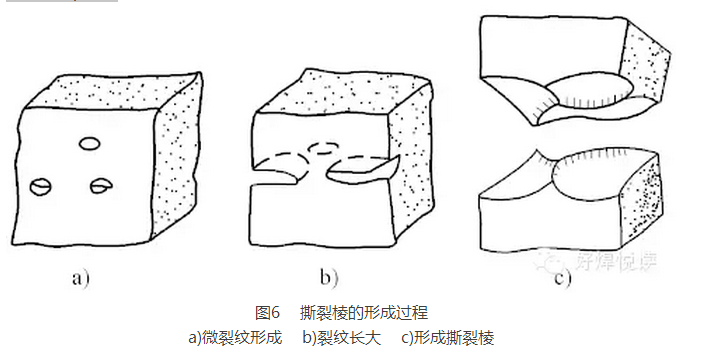 (3)準(zhǔn)解理斷裂(QuasiCleavage fracture,QC) 其斷口形貌類似于解理斷裂但又有區(qū)別,故稱準(zhǔn)解理斷裂。準(zhǔn)解理斷裂與解理斷裂一樣,都是穿晶型的斷裂,除具有脆性斷口的特征之外,還有明顯塑性變形的撕裂棱,如圖5c所示。撕裂棱是由許多單獨(dú)形核的微裂紋相互連接匯合而成,形成的過程如圖6所示。準(zhǔn)解理斷口的特征是短程的河流狀花樣,常在局部地區(qū)形成裂紋,又在該地區(qū)短程擴(kuò)展,形成大量短而彎曲的撕裂棱。有時(shí)在短程河流花樣之間出現(xiàn)二次裂紋。