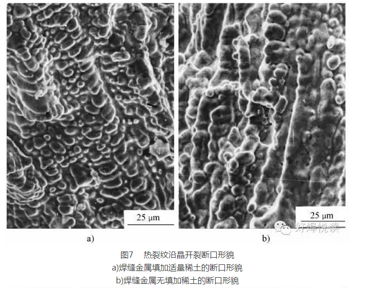 由于液化裂紋的形成與低熔點(diǎn)共晶間相的重熔液化或組分液化形成的晶間液膜有直接關(guān)系,所以液化裂紋的斷口上有開裂后液相沿晶界面凝固的痕跡。由于熱影響區(qū)晶界液化所形成的液相往往與基體成分相差很大,也不易形成很厚的液層,而且原奧氏體晶界面一般較平坦,所以液化裂紋斷口上不易出現(xiàn)發(fā)達(dá)的樹枝晶結(jié)構(gòu),而常常能觀察到的各種共晶在晶界面上凝固的典型形態(tài)。