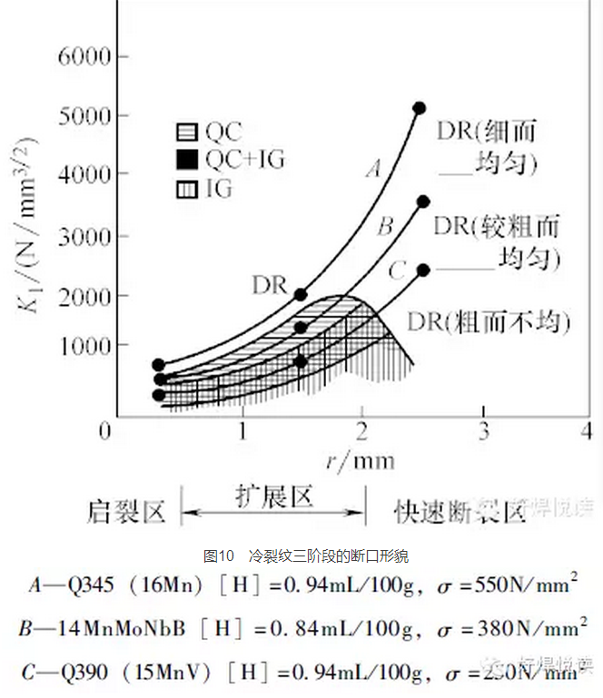焊接冷裂一般具有延遲的特征,因此冷裂的斷裂也是分階段進(jìn)行的,冷裂紋的斷口形態(tài)可分為三個(gè)特征區(qū),即啟裂區(qū)、擴(kuò)展區(qū)(放射區(qū))和終斷區(qū),與此對(duì)應(yīng)的斷口形貌也發(fā)生相應(yīng)的變化。插銷試驗(yàn)時(shí),某些低合金鋼焊接冷裂紋的啟裂、擴(kuò)展和最終斷裂三個(gè)區(qū)的斷口特征可歸納如圖10所示。
